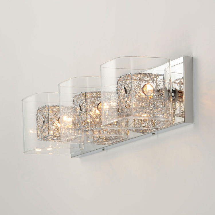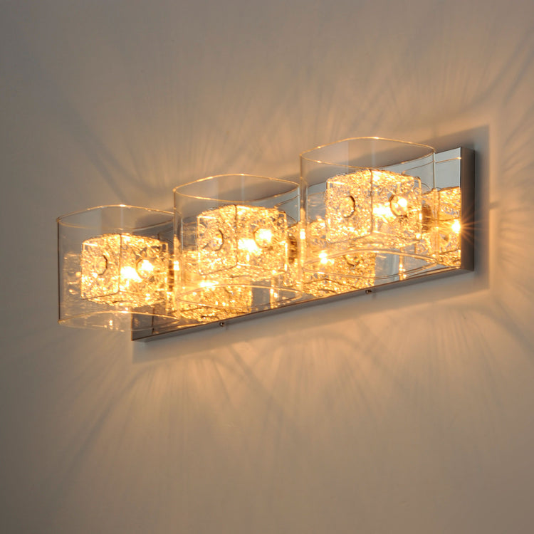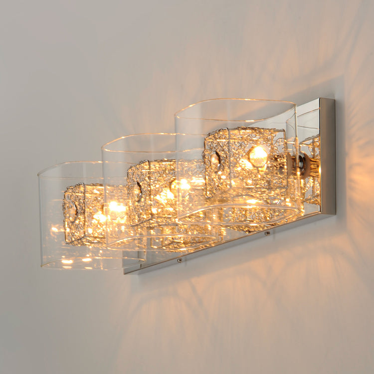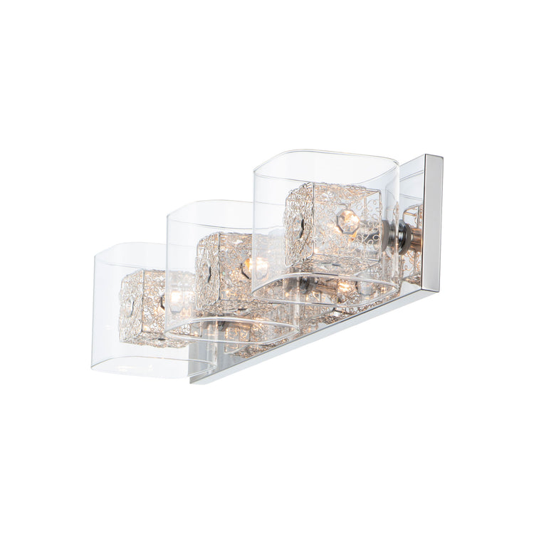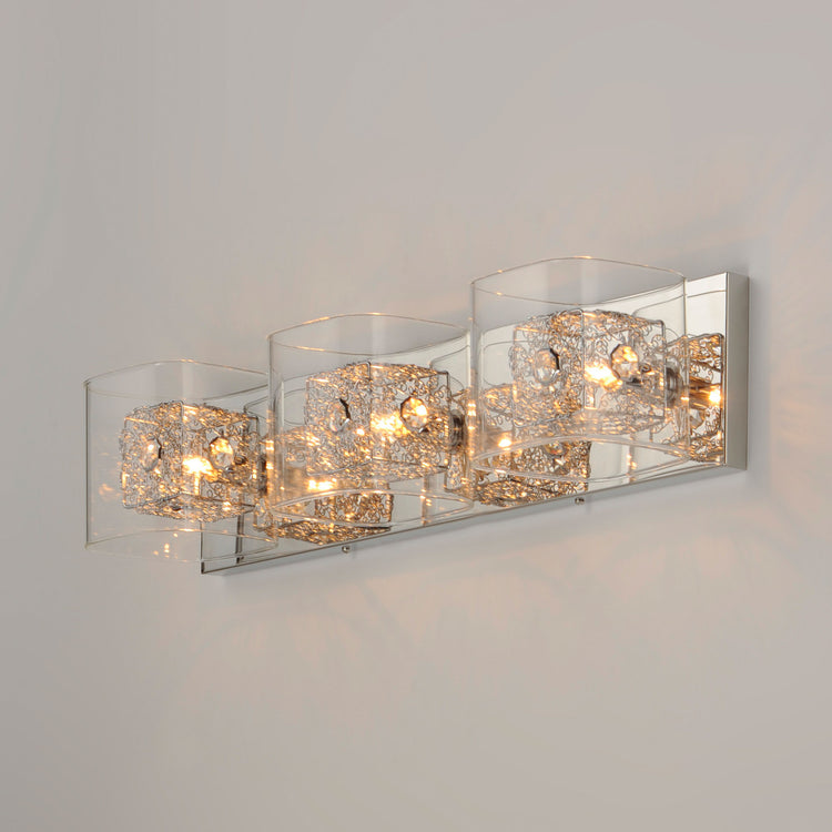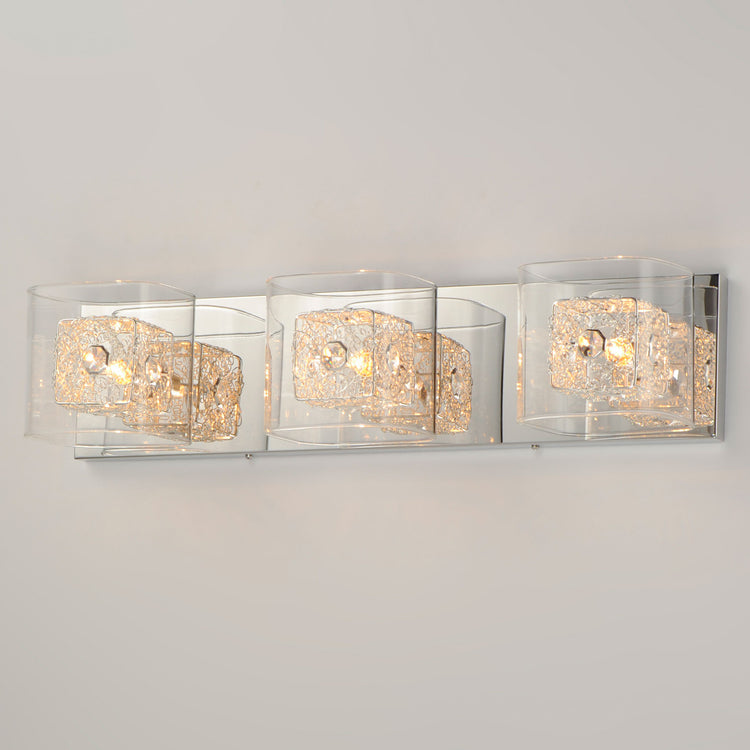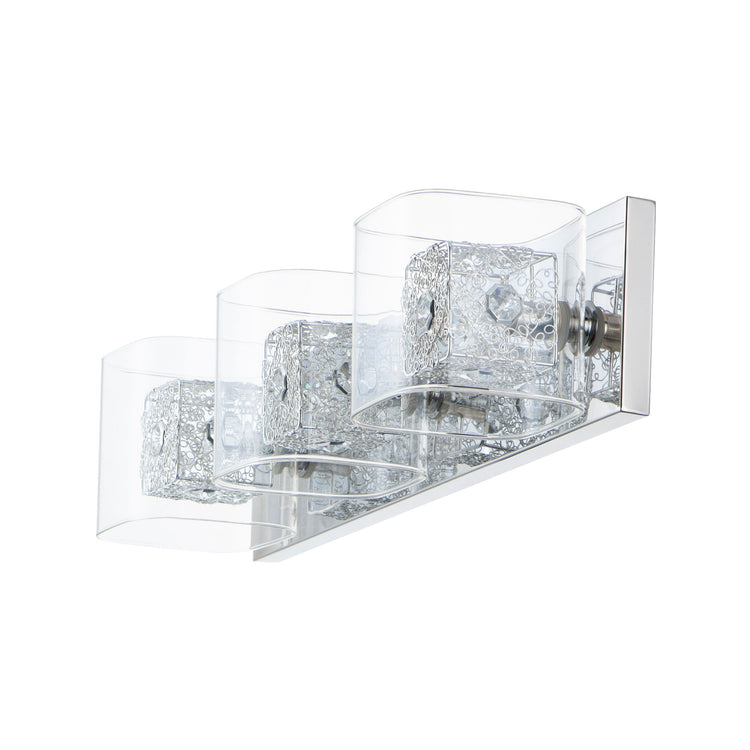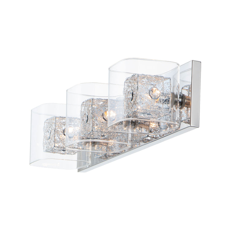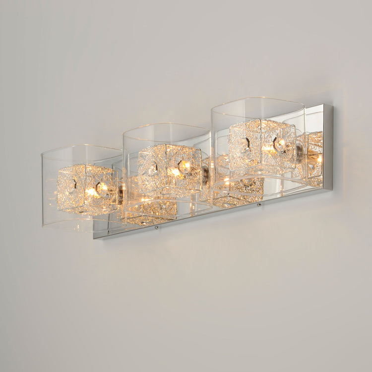 With the illusion of floating on air, the Gem Collection offers a touch of mystery to any room. Intertwined metal cubes are encased by clear crystal cubes, allowing xenon light to shine from within and bursting out through the embellished crystal. Inner metal cubes come in two options, Polished Chrome (PC) and Silver (SV).