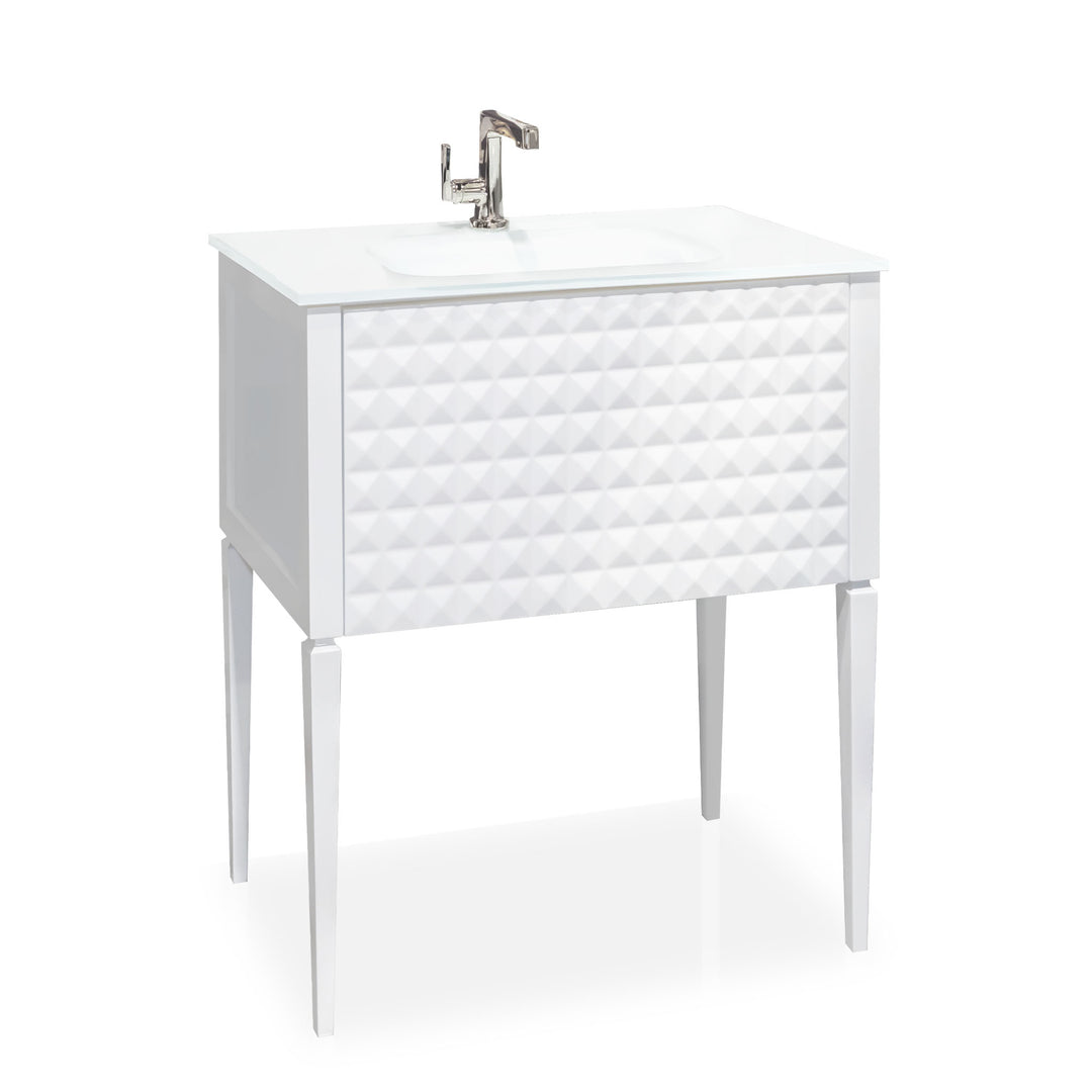 London 80 cm bathroom vanity. Set of bathroom furniture made in solid wood lacquered in Antique Silver patinated. Countertop in White Quartz and washbasin in White Ceramic.