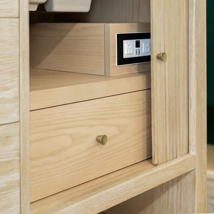 The cerused Sunwashed Oak finish creates a captivating warmth that is accentuated by Champagne Brass hardware. 3 drawers and two tambour doors with an interior shelf and drawer provide ample storage while maintaining a sleek profile. With the addition of two integrated power outlets and a lower shelf make this vanity incredibly functional.