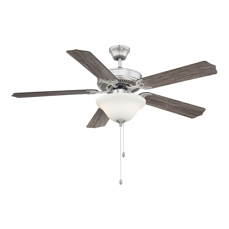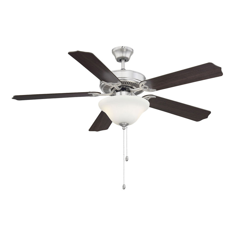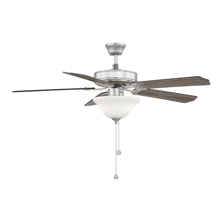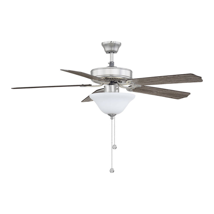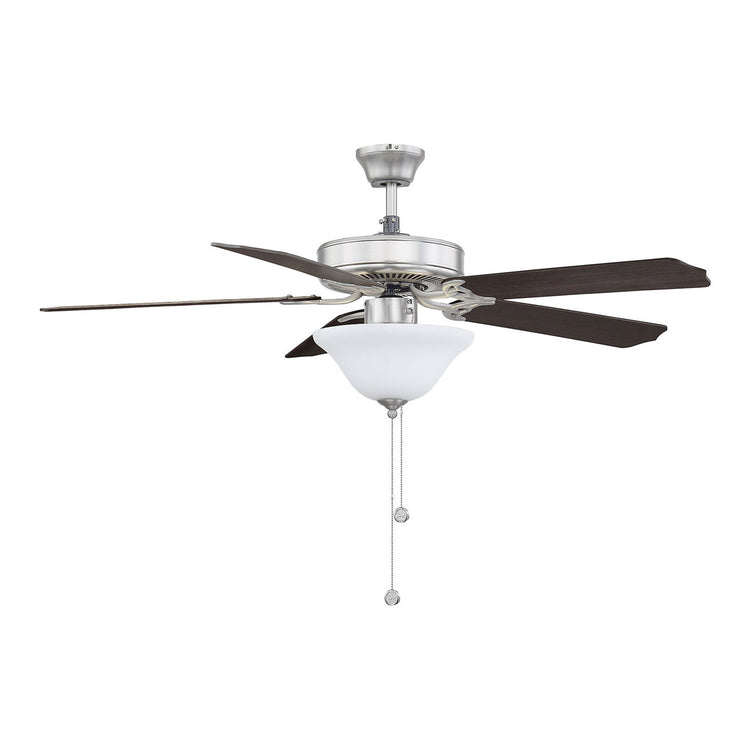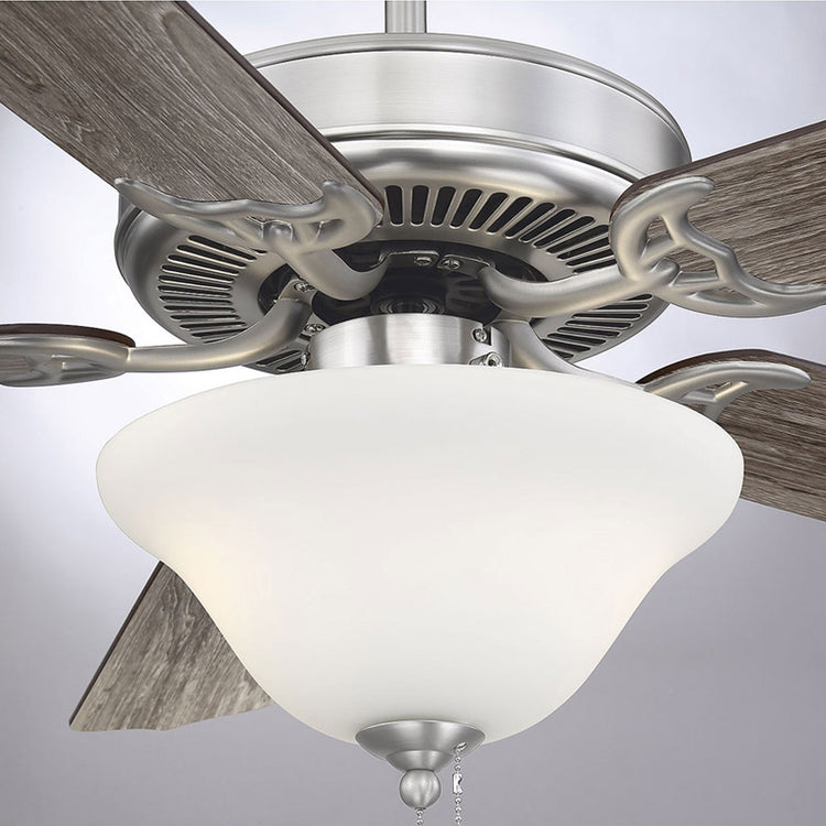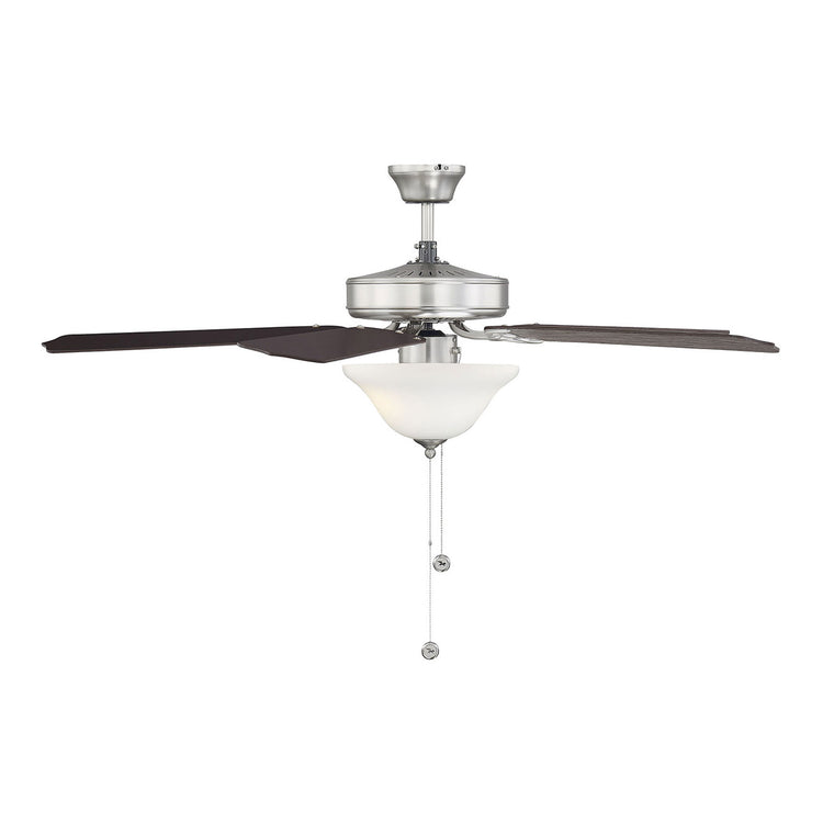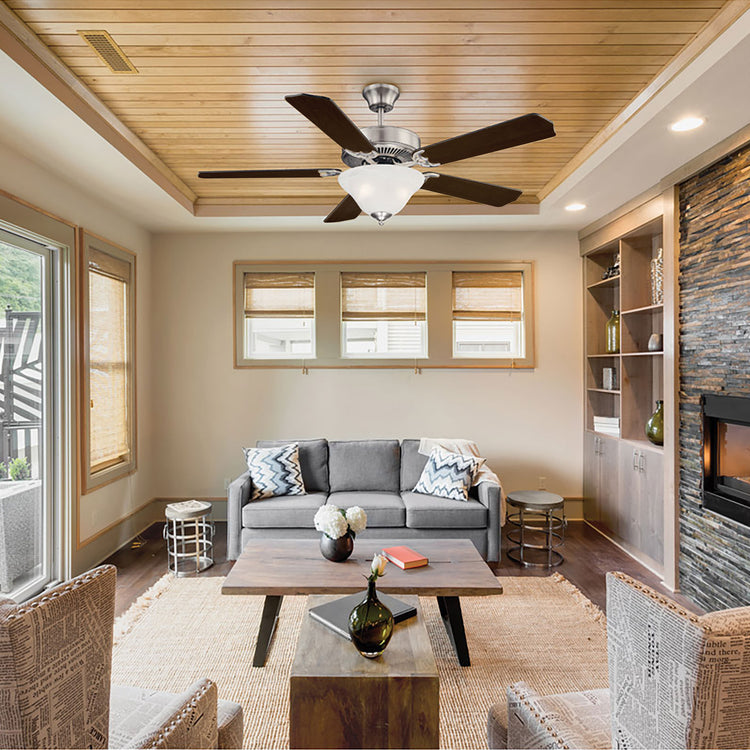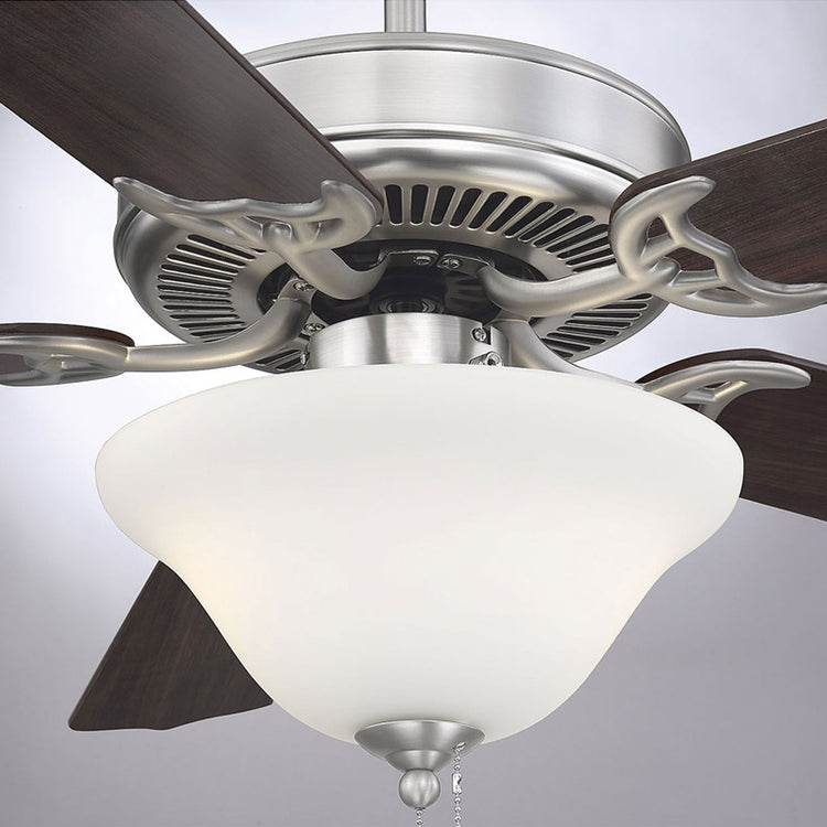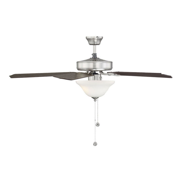 Classic ceiling fan style with incredibly versatile finishes. Youll love the timeless color combination of satin nickel finish and white glass lamp shade it matches beautifully with other finishes and color schemes in your home, whether in your living room, family room, bedroom, or home office. And the fixture design seamlessly blends with traditional, transitional, or modern farmhouse decor. A powerful motor and 52" blade span provide comfort two included 9W LED bulbs provide superb light. This ceiling fan features a pull chain for 3-speed, reversible control and includes a dual mounting system, with downrod and hugger, for most ceiling heights. All together its a terrific value classic style plus high-quality Savoy House performance.