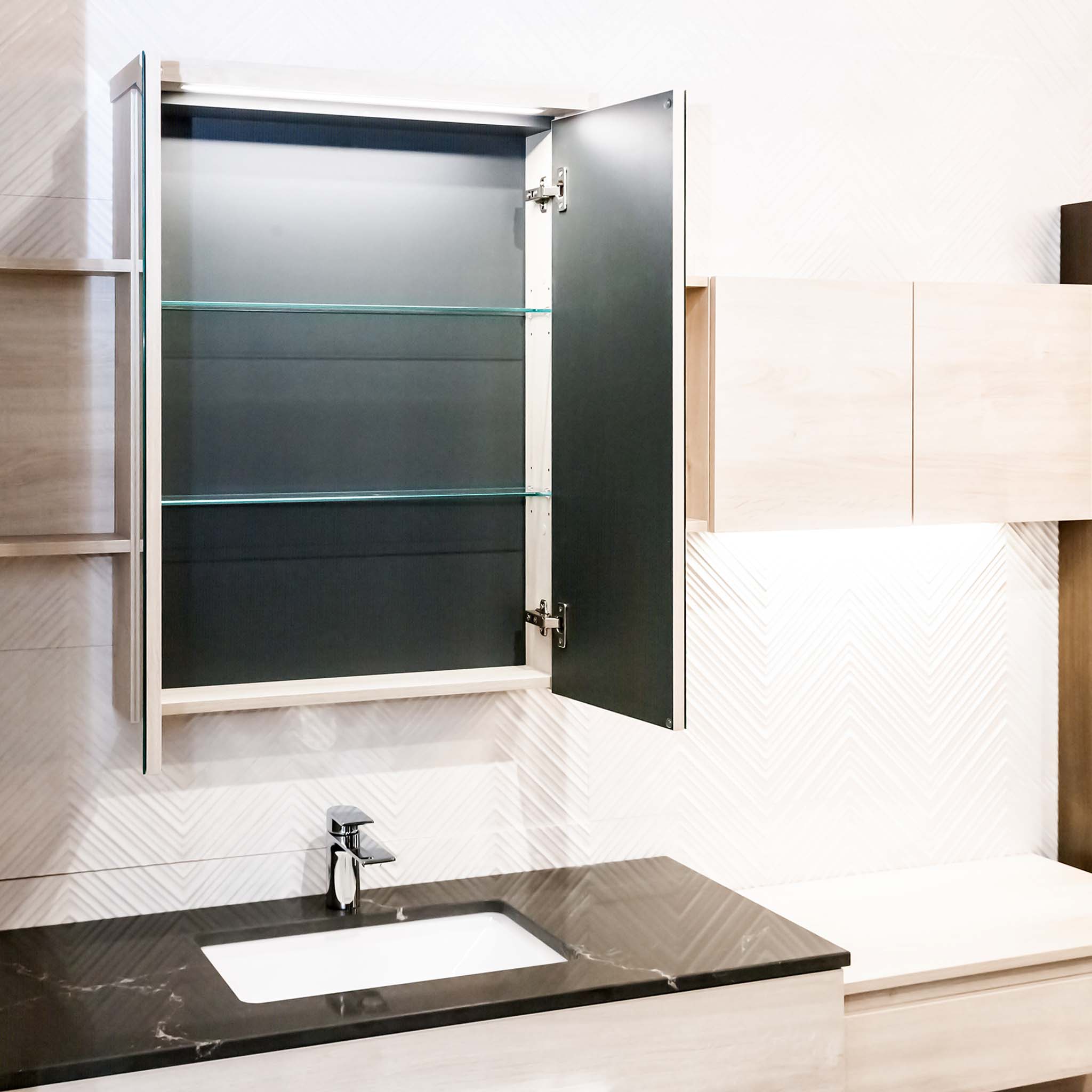 Sweet Home double sink bath vanity with 2 medicine cabinets & 12" linen cabinets, an attractive design and the signature of a contemporary bathroom.